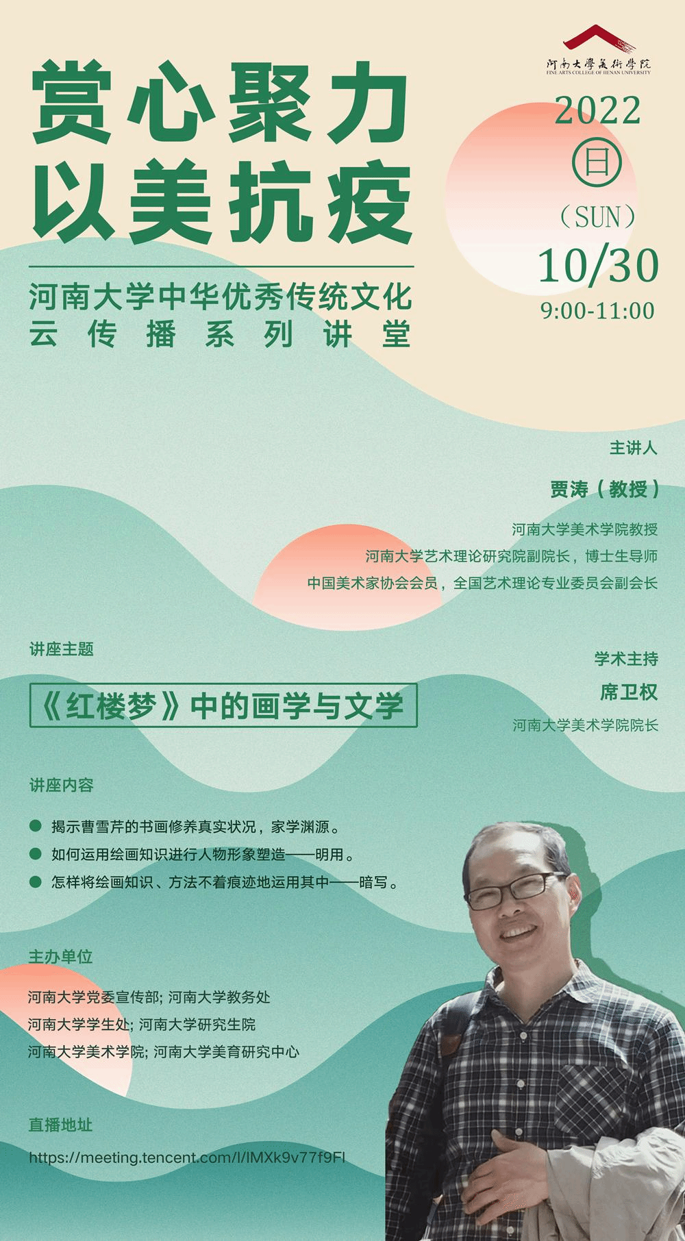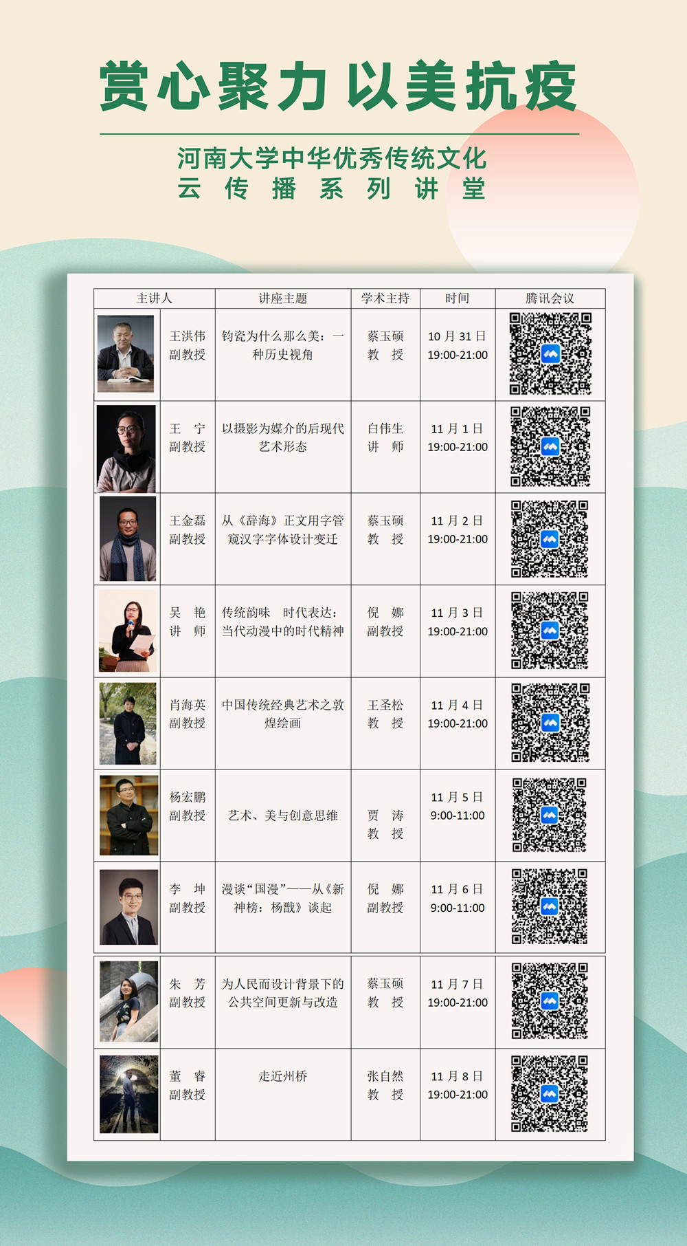 10月29日-11月8日,“赏心聚力、以美抗疫——今年会jinnianhui官网中华优秀传统文化云传播系列讲堂”开讲啦!十位今年会jinnianhui官网美术学院的老师与“你”相约云端,意会古今,温馨畅神。让我们静下心来,共同开启一场中华优秀传统文化的大美之旅;让我们一起努力,弘扬中华优秀传统文化,铸就社会主义文化新辉煌!