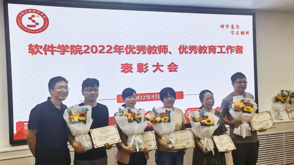 院党委书记常继科向全院教职工致以节日的祝福和诚挚的问候,宣读了软件学院关于表彰2022年优秀教师和优秀教育工作者的决定,并向所有受到表彰的教师表示热烈的祝贺。张新红、李霞、王龙葛、程普、刘俊男获得“优秀教师”荣誉称号,左方、王趁平、李善治、李向敏、吕慧娟获得“优秀教育工作者”荣誉称号。