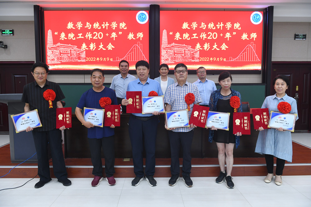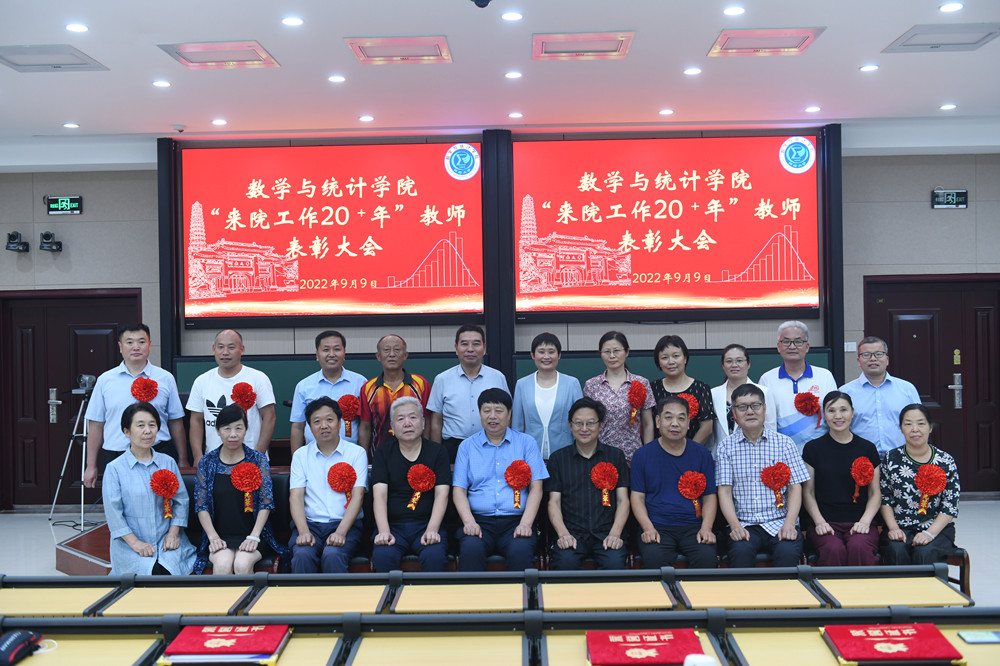 为庆祝全国第38个教师节,表彰先进教师,致敬辛勤工作在教学、管理一线的教职员工,9月9日下午,数学与统计学院在学院南阶梯教室举行“来院工作20+年”教师表彰大会。出席表彰大会的有校党委常委、副校长冯淑霞,学院领导班子成员,受表彰的教师和部分教师代表、各年级学生代表等与会。会议通过线上线下相结合方式开展,由院长韩小森主持。