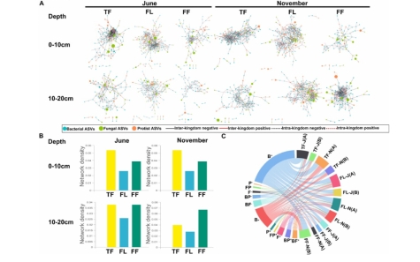 土壤微生物群落构建:实验室成员调查了黄河中下游嫩滩、农田和弃耕地三类土地利用类型下细菌、真菌和原生生物群落构建过程和共生网络模式的差异,发现:①相比于微生物α多样性指数,微生物群落的组成和结构更容易受土地利用类型的影响;②微生物群落结构的变化与土壤肥力的差异有关。在嫩滩和弃耕地,随机过程对细菌、真菌和原生生物群落构建的贡献高于农田;③在这三种土地利用类型中,嫩滩土壤微生物网络最稳定,而弃耕地的微生物网络最不稳定。研究结果为滩涂生态系统的可持续管理和保护提供科学依据,并分别发表在国际知名期刊Applied Soil Ecology和Journalof Plant Ecology上,实验室博士后余炎炎和博士生董雄德分别为论文第一作者。