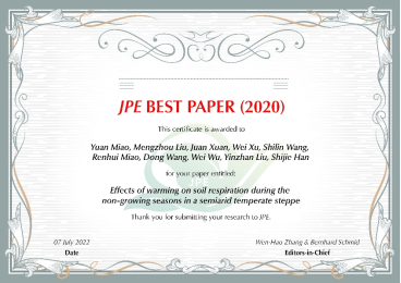 土壤碳排放:实验室成员依托非对称性增温实验平台,研究了非生长季增温对温带半干旱草原土壤呼吸的影响,发现:①土壤温度、微生物生物量碳和氮的变化调控了土壤呼吸对模拟增温的响应;②草地植物群落结构和组成对生长季后期干旱响应大于前期干旱的响应。研究成果分别发表在Journalof Plant Ecology和Journal of Vegetation Science上,苗原副教授和苗仁辉副教授分别为论文第一作者。其中,苗原副教授的论文获得Journalof Plant Ecology2022年度最佳论文奖。