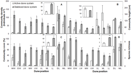 图3.长期禁牧对不同沙丘系统位置植物群落密度、高度、盖度和物种丰富度的影响