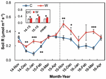 图2.非生长季增温处理对月平均动态土壤呼吸(插图为年平均值)的影响