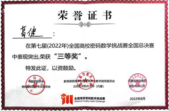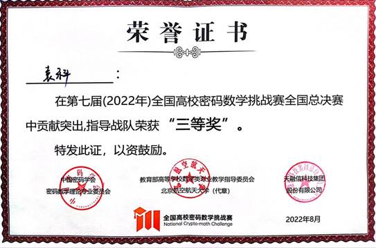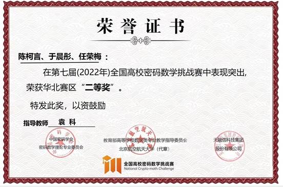 8月19日,第七届全国高校密码数学挑战赛总决赛在华中科技大学完美收官。今年会jinnianhui官网计算机与信息工程学院共有7支队伍参赛,最终“SpecialRain”战队(队员:周柄材、葛健;指导教师:袁科)和“密码小白冲冲冲”战队(队员:陈柯言、于晨彤和任荣梅;指导教师:袁科)分别荣获全国三等奖和华北赛区二等奖的好成绩,实现了学院在该赛事上零的突破。